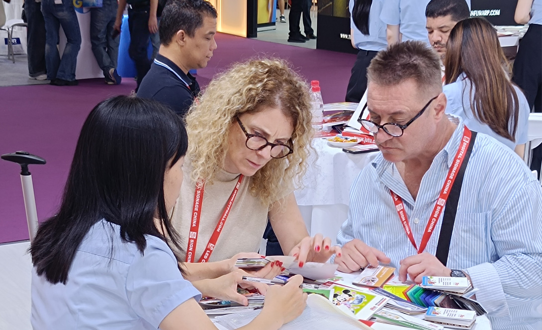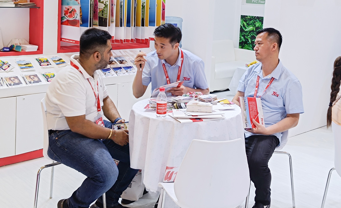 Die meisten Kunden interessieren sich für PVC-Schaumplatten, selbstklebendes Vinyl, umweltfreundliche Produkte und interessieren sich für unsere neuen magnetischen Aufkleber. Einige Kunden haben eigene Muster mitgebracht und hoffen, einen geeigneten Lieferanten zu finden.